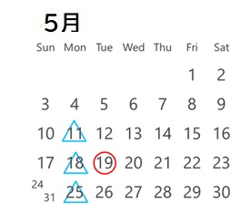休館日カレンダー (〇全館、□本館のみ、△西部、◇二見のみ)